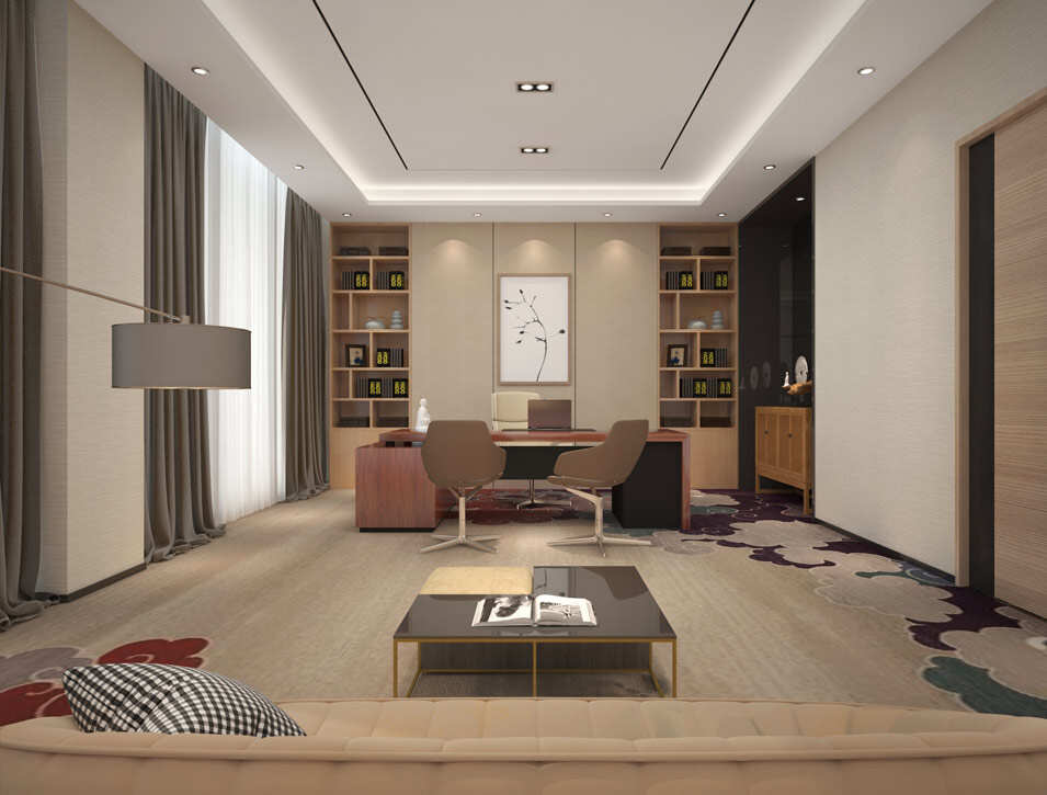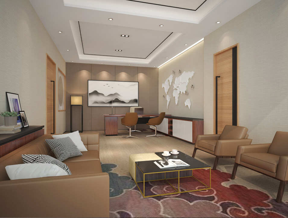 設計介紹:現代辦公室裝修風格,根據公司的產品特點,選用白色,棕黃色為主,前臺原生態的木樁凳子、木色前臺桌,紋理的地板搭配不一樣的風格,會議室注重采光,頂部明亮的燈,通透的玻璃可以光引到空間里,領導辦公室墻壁上掛著寫意畫十分有藝術感,棕色的皮質從色彩效果來講,棕色也是百搭的不二之選,為領導的空間帶來一定品質感。