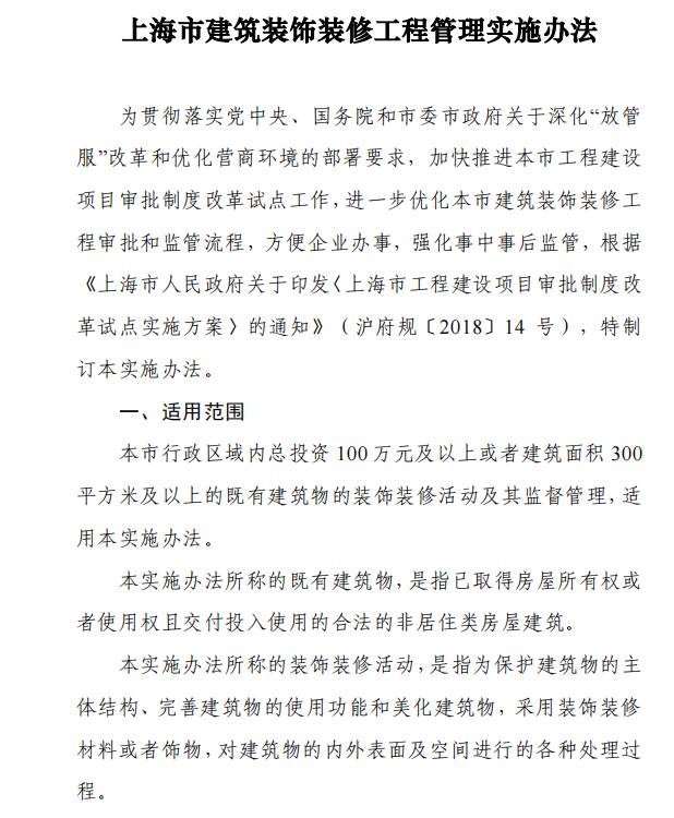 上海市辦公室裝修工程分為一般類裝修工程和特殊類裝修工程兩類。按照分類實(shí)行差別化管理、分類審批。一次申報(bào)多個(gè)建筑單體或者部位實(shí)施裝飾裝修,凡有一個(gè)及以上建筑單體或部位涉及特殊類裝修內(nèi)容,該裝飾裝修工程按照特殊類裝修工程進(jìn)行審批。