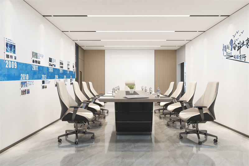 其次是會議室及洽談室這一類的獨立功能性區域,不僅需要考慮功能性照明,也許需要將空間的氛圍體現出來。比如使用內嵌的線條燈和在其兩邊布置射燈突出會議室嚴肅的氣氛;使用線條燈和筒燈做一些造型用來使洽談室和茶水室氣氛活躍;