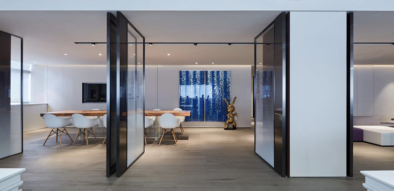 3、固定隔斷常用的分為:石膏板隔斷、玻璃隔斷兩種。石膏板隔斷使用率很高,常用于基本的房間分割,背景墻造型,除了通透感差、不利于房間采光這點以外,是最常用的分割空間的手段。想要透光性好一些可以用玻璃隔斷,玻璃的透明度很高,在視覺上能有效提升開闊性,讓辦公室感覺更寬敞。