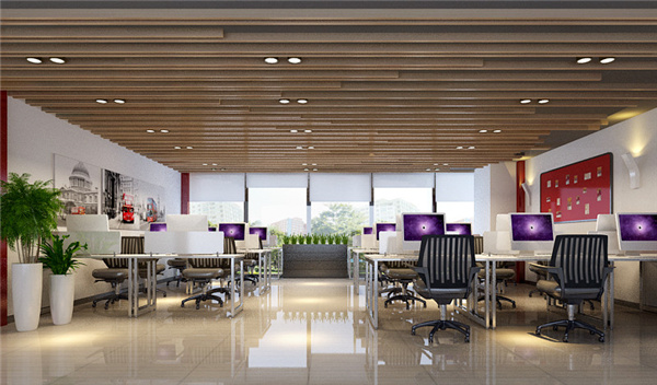 2、整個空間采用的是以暖色調為主,燈光都是以LED燈為光源,與整個自然光源與人造光源完美的結合在一塊。員工辦公室裝修設計:格柵做頂面,空間造型重點一下子就在頂面上。